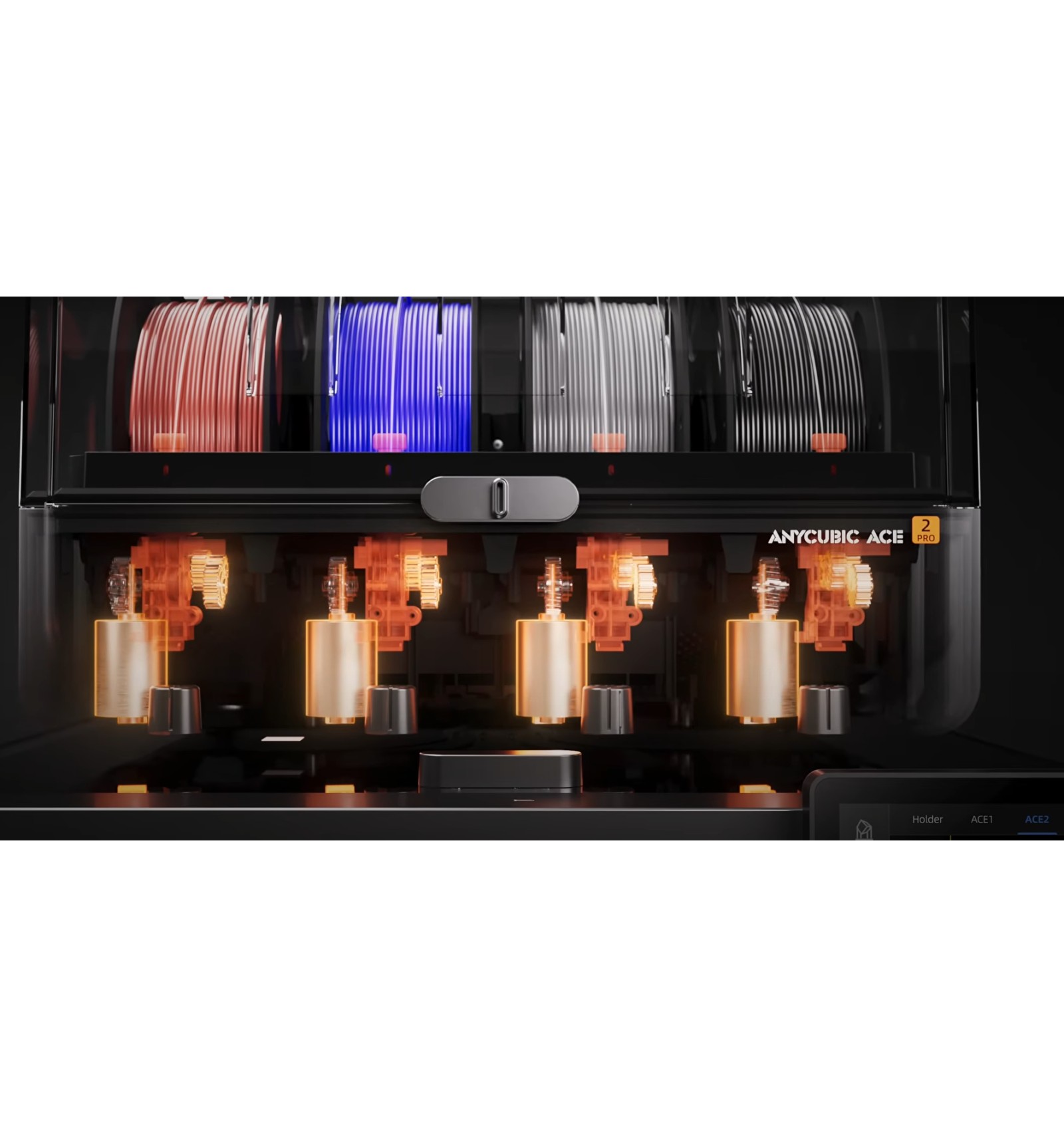 Anycubic ACE 2 Pro es un sistema inteligente de gestión de filamento que permite impresión multicolor y secado activo a 65 °C. Gracias a sus 4 motores independientes y su función de cambio automático de carrete, maximiza la eficiencia, elimina desperdicios y garantiza que el material esté siempre seco durante la impresión.